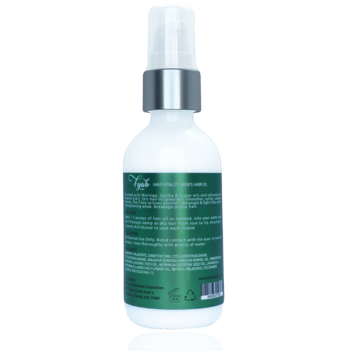 • FYAB Men's Hair Oil enriched with Moringa, Jojoba & Argan oils and infused with Vitamin A & E. The 5 key active ingredients work to nourish, detangle & fight frizz while strengthening weak, breakage-prone hair.